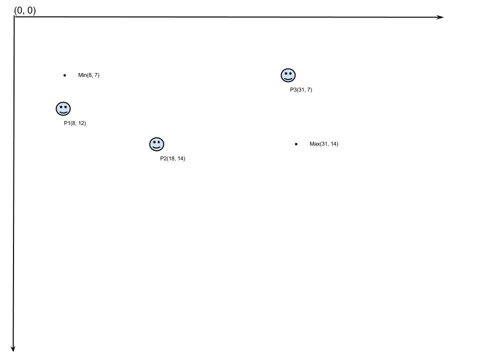 The smiley faces represent our three players, and their positions. Following the above pseudocode, we come up with a min of (8, 7) and a max of (31, 14). This gives us the outermost coordinates of the area our players are in.